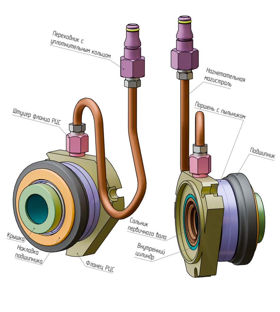 В комплекте: сборка РЦС, трубка нагнетательная в сборе с переходником и его уплотнением, болты с внутренним шестигранником (3 штуки) для крепления РЦС к фланцу КПП, уплотнительное кольцо фланца, смазка специальная для шлицев первичного вала (Sachs 4200080050).