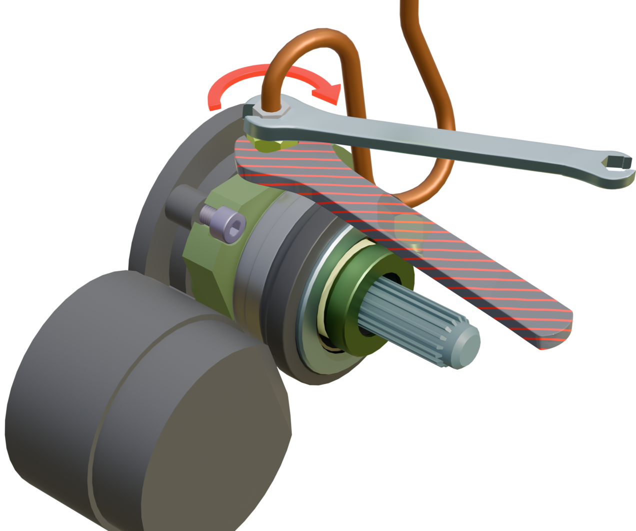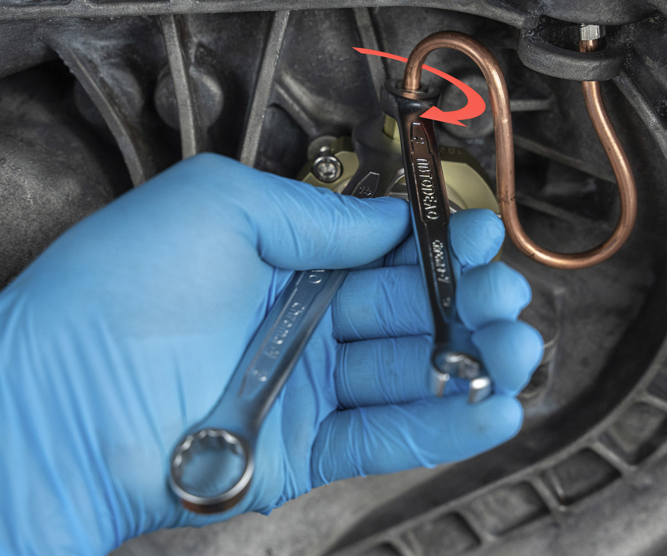 Прикрутить штуцер специальным (разрезным) ключом для тормозных трубок на 10 мм и обычным рожковым ключом на 14 мм. Очень важно при скручивании штуцера трубки и цилиндра опираться только на ключи, не передавая весь крутящий момент при затяжке на штуцер фланца (его резьба прочно склеена с резьбой во фланце, но не нужно прикладывать к нему крутящий момент). Обратите внимание на положение руки при этом на иллюстрации.