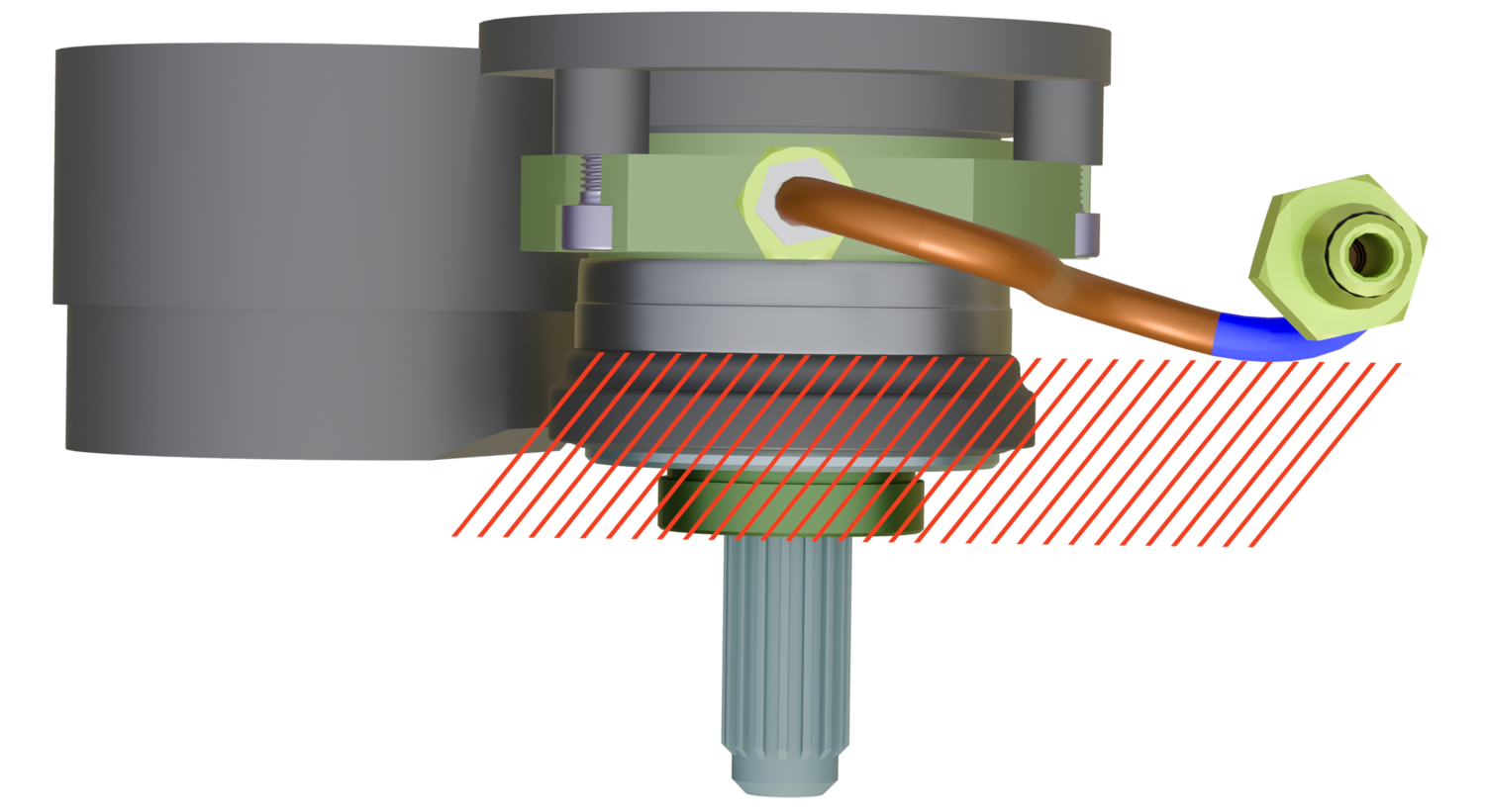 На иллюстрации мы приблизительно обозначили красной штриховкой область, в которую трубка попадать не должна: эта область условно проходит через основание подшипника.