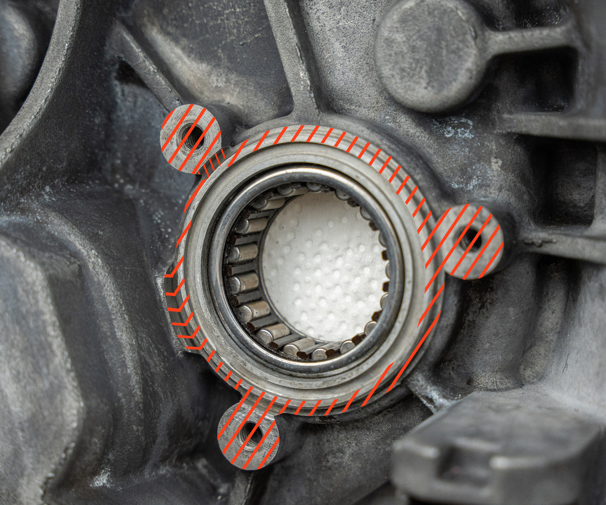 1. Очистить фланец в картере КПП настолько хорошо, насколько это возможно. На иллюстрациях заштрихована поверхность, на которую опирается РЦС. Если с этой поверхности не удалить загрязнения (окислы, грязь, песок, герметики, остатки уплотнений и т.п.), то добиться совпадения оси вращения первичного вала и сцепления с осью поршня РЦС не удастся, что приведет сначала к перегреву уплотнений РЦС и его подшипника, а затем — начнутся утечки и разрушение подшипника. А если все будет чисто, то фланец РЦС сможет занять идеальное правильное положение, чтобы система работала без лишнего трения (тогда и тепла излишнего выделяться не будет).