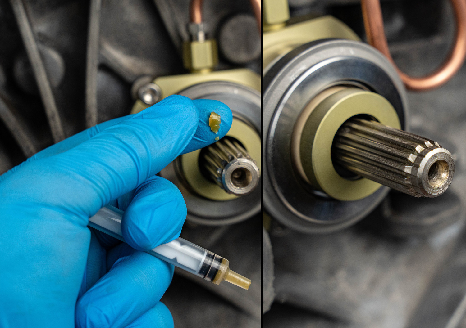 10. Смазать шлицы первичного вала КПП очень тонким слоем (1 г или меньше) специальной смазкой (Sachs 200 080 050) из шприца в комплекте.